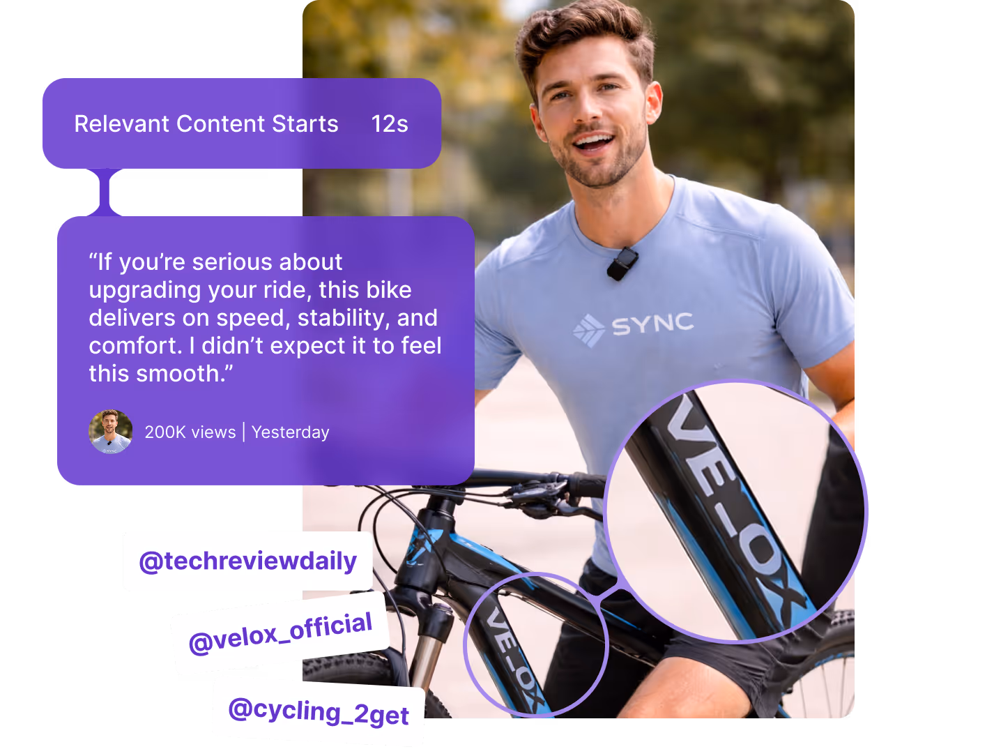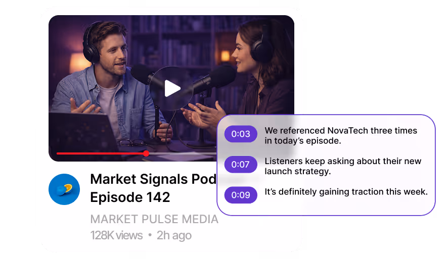 Automatic Speech Recognition (ASR) transcribes long-form video, podcasts, and short-form content, identifying brand mentions buried deep in the transcript. We know when your brand is spoken, not just written.